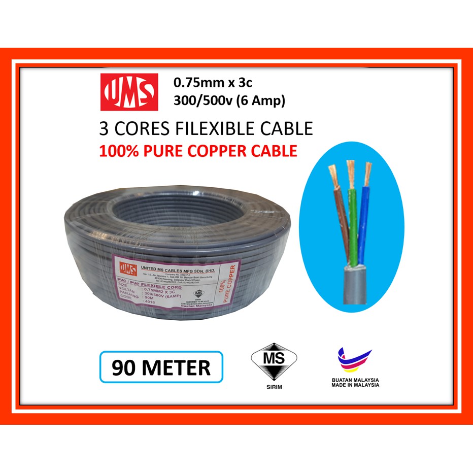 Ums 0 75mm X 3c 100 Pure Copper Sirim Pvc Flexible 3 Cores Cable Wire 6amp Shopee Malaysia